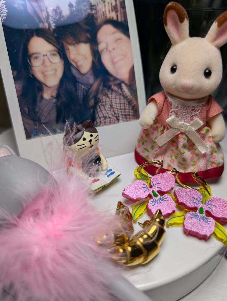 Eso seguro que no te lo esperabas. Igual que no te esperabas compartir espacio con dos pares de pendientes –unos me los trajeron los Reyes Magos y son dos flores tropicales fucsias y amarillas, y otros me los regalaron mis compañeros cuando cumplí 36 y monté un karaoke temático de Taylor Swift, y son dos cruasanes– un muñeco de un gatito que me regaló Cris cuando le conté que estaba pocha, un Ternurín conejo con un lazo en la cintura y una polaroid con dos de mis mejores amigas: Marta y Nuria. Tú no las conoces pero son como un dúo musical pero de los que no se enfadan ni luchan con sus egos gordos a ver quién ha sacado la mejor estrofa para la mejor canción. Son, cómo decirte, un soplo de magia; si se te acercan, las plumas rosas que te cuelgan, echarán a bailar y te harán cosquillas, y ya no serás jamás la misma persona, que sé que no eres persona, sino objeto, pero yo creo que en el fondo todos los bolis sois un poco personas porque tenéis la capacidad de dar vida a esos mensajes e historias que, de otro modo, solo vivirían en el silencio de la cabeza de un alguien cualquiera.